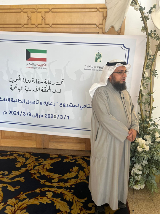دشّن مكتب الهيئة الخيرية في الأردنّ بالتعاون مع جمعية صندوق حياة للتعليم الخيرية الحفل الختامي لمشروع "رعاية وتأهيل الطلبة النابغين والمتميزين" تحت رعاية نائب رئيس البعثة الدبلوماسية الكويتية في الأردن المستشار ناصر المطيري وبحضور ممثل الهيئة الخيرية د. محمد الجفيري، ومدير مكتب الهيئة في الأردن د. مصطفى العواد، وممثل جمعية صندوق حياة للتعليم الخيرية موسى الساكت وعدد من كبار المتبرعين، والداعمين والطَّلبة.