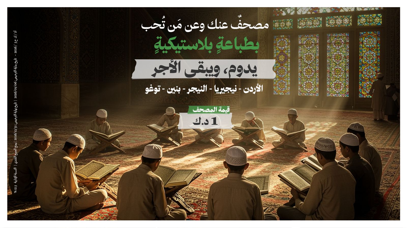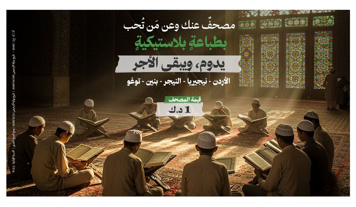 مصحفٌ واحدٌ يمكن أن يُخرج حافظًا أو معلمًا أو إمامًا، ليبقى أثر صدقتك يتضاعف مع كل حرفٍ يتعلّمه أحدهم ويُعلّمه لغيره.